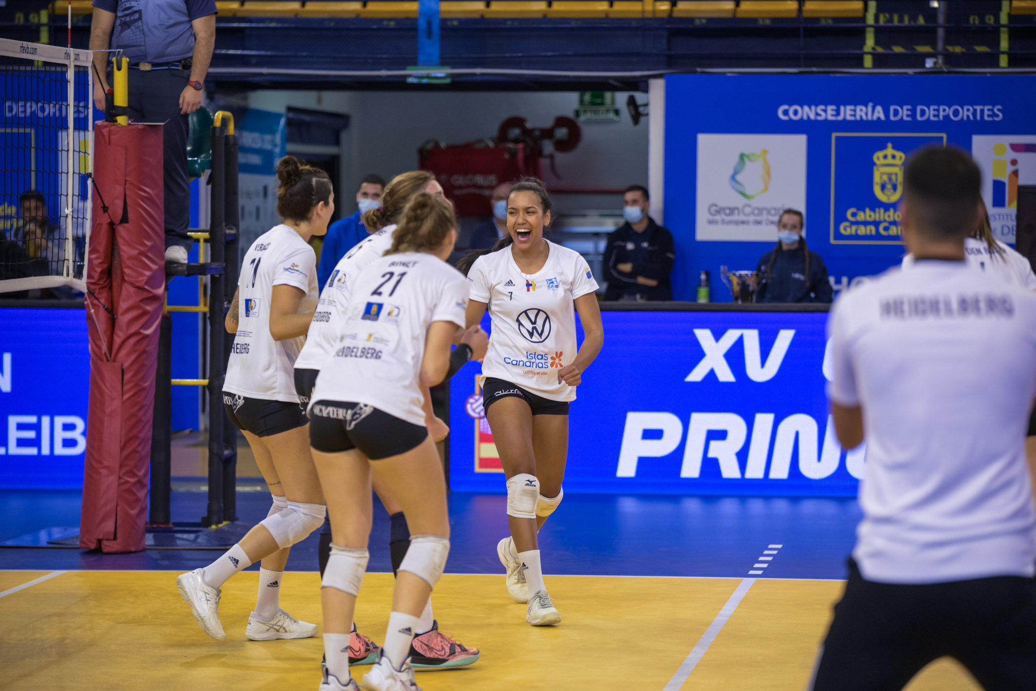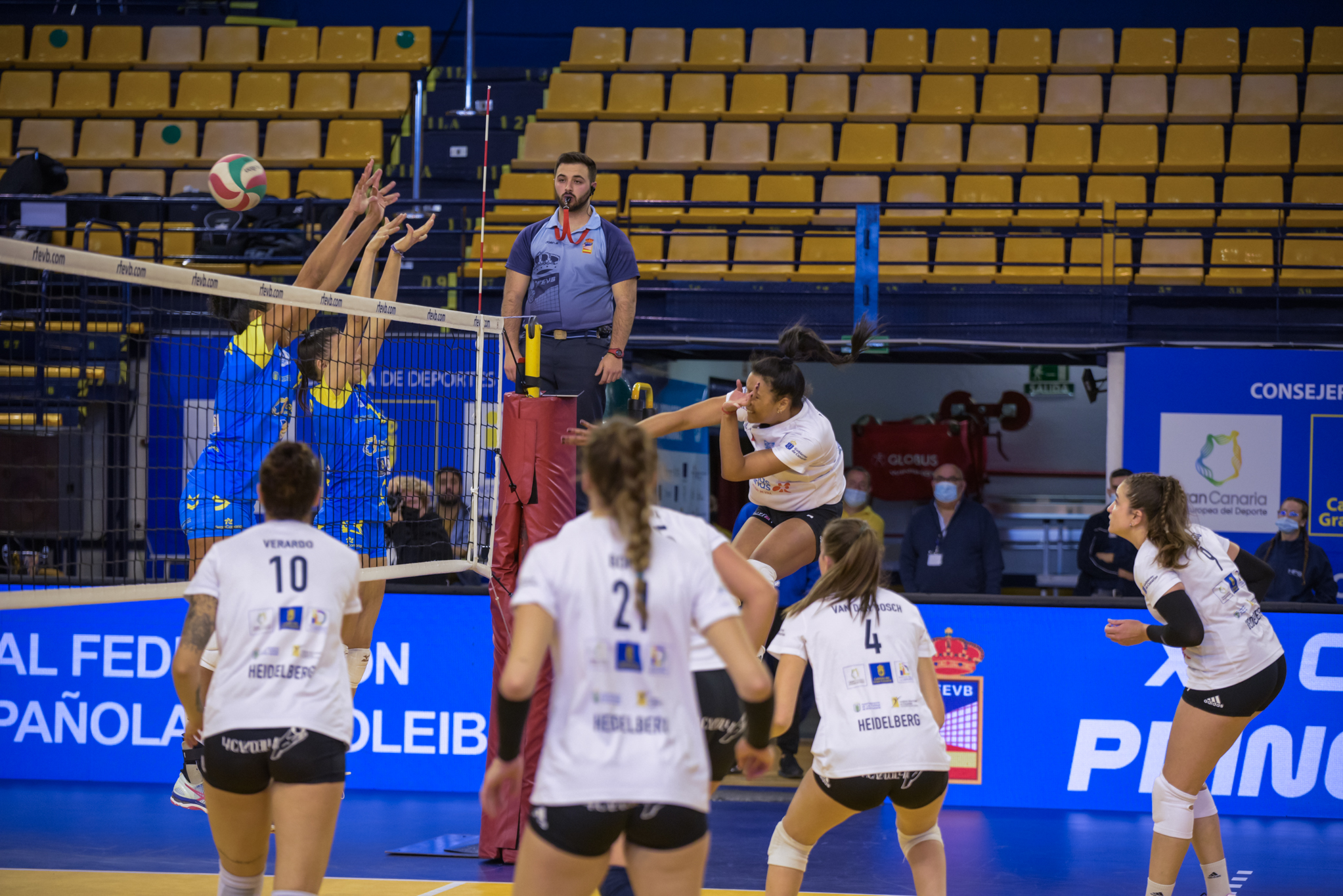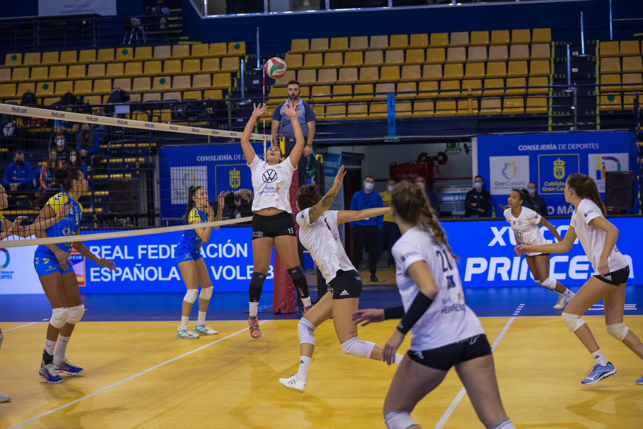 Santi Guerra pedía cabeza a sus jugadoras, pero el 7 Palmas no hacía concesiones y sacaba a relucir su mejor voleibol en esta Copa Princesa, obligando al Heidelberg a agotar su último tiempo muerto tras una diagonal para sortear un triple bloqueo de Cristina Erdocia que colocaba el 16-6 en el electrónico.