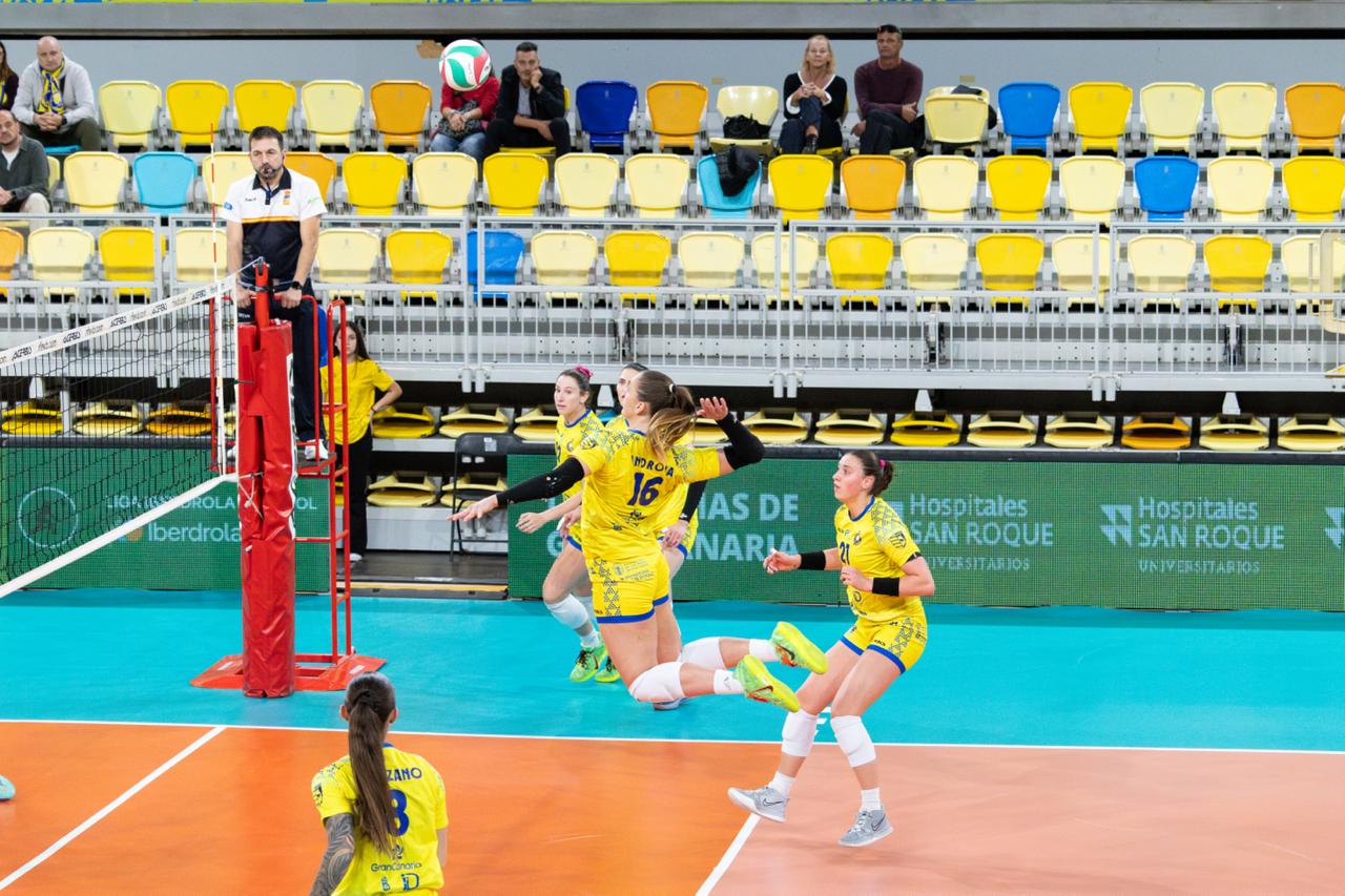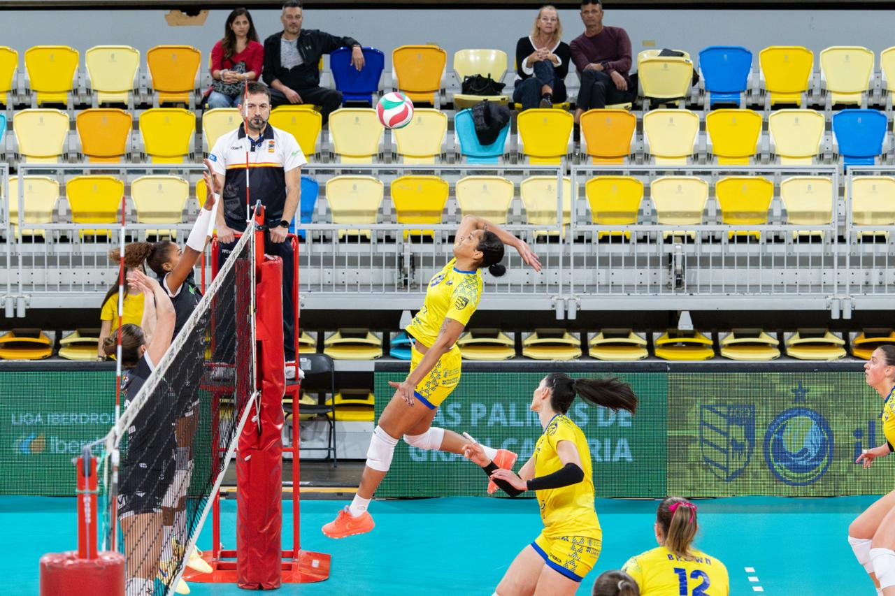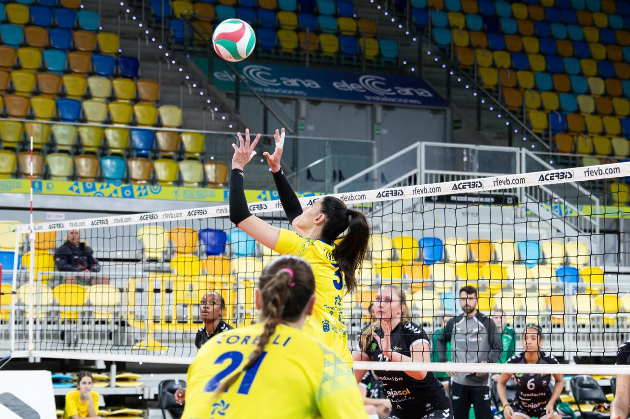 El duelo volvió a igualarse en el tramo final (23-23), pero fue Saray Manzano la que decantó el primer acto con un ataque, primero, y un bloqueo, después, que adelantaba a las grancanarias (25-23).